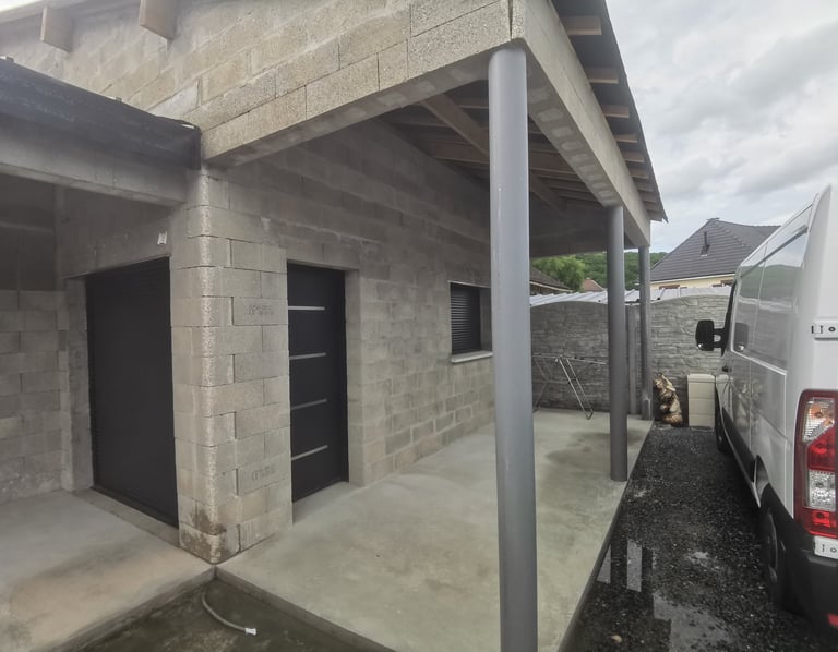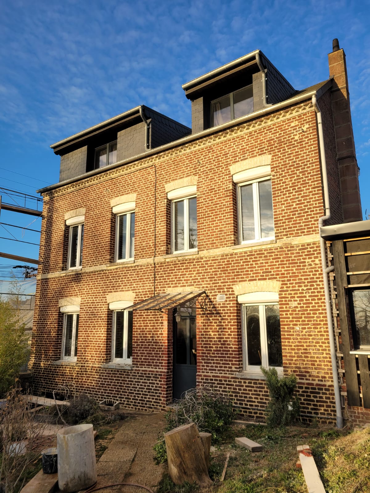Ravalement complet d'une maison neuve en briques terre cuite du coté d'Amiens. Des cornières noires ainsi que deux bandes ceinturantes tout autour de la maison.