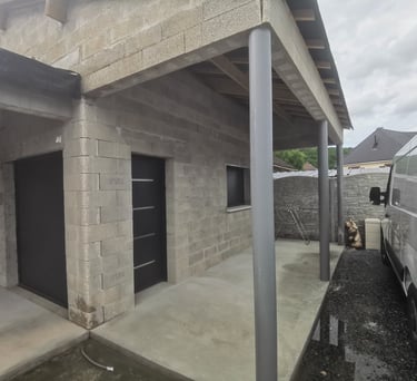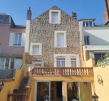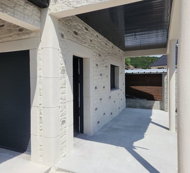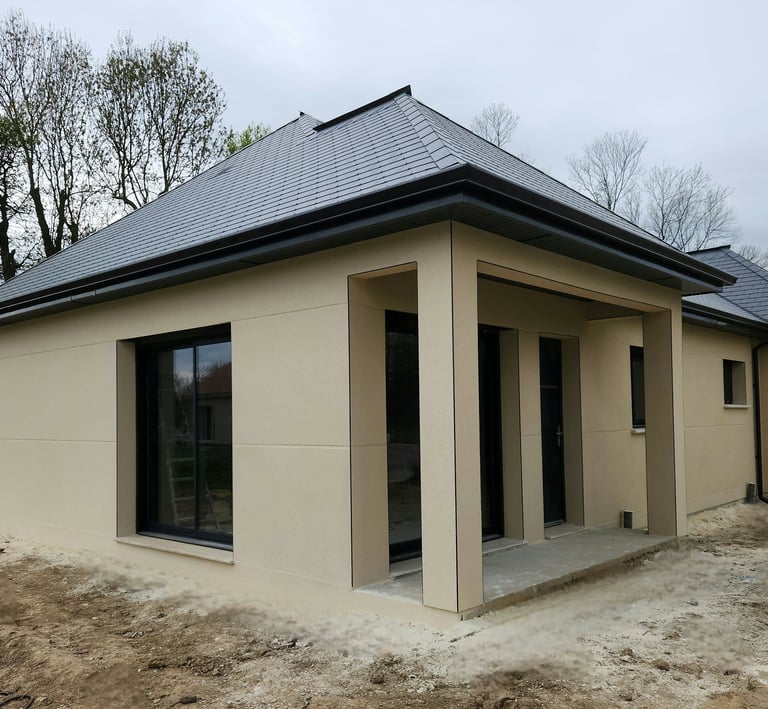 Maison complète à Deauville. Deux finitions : un gratté avec des cornières noires sur la maison et un intérieur effet pierre sans teintes. De la sobriété.
