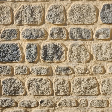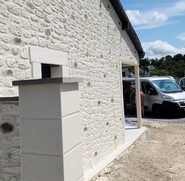Façade et pignon d'une maison à Caen, pierres sans teintes façon rustique, chaînages et encadrements en finition gratté. Du réconfortant.