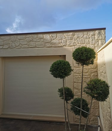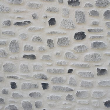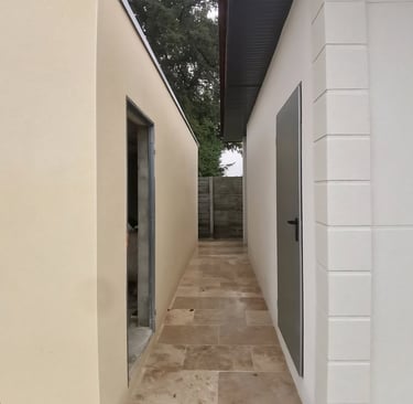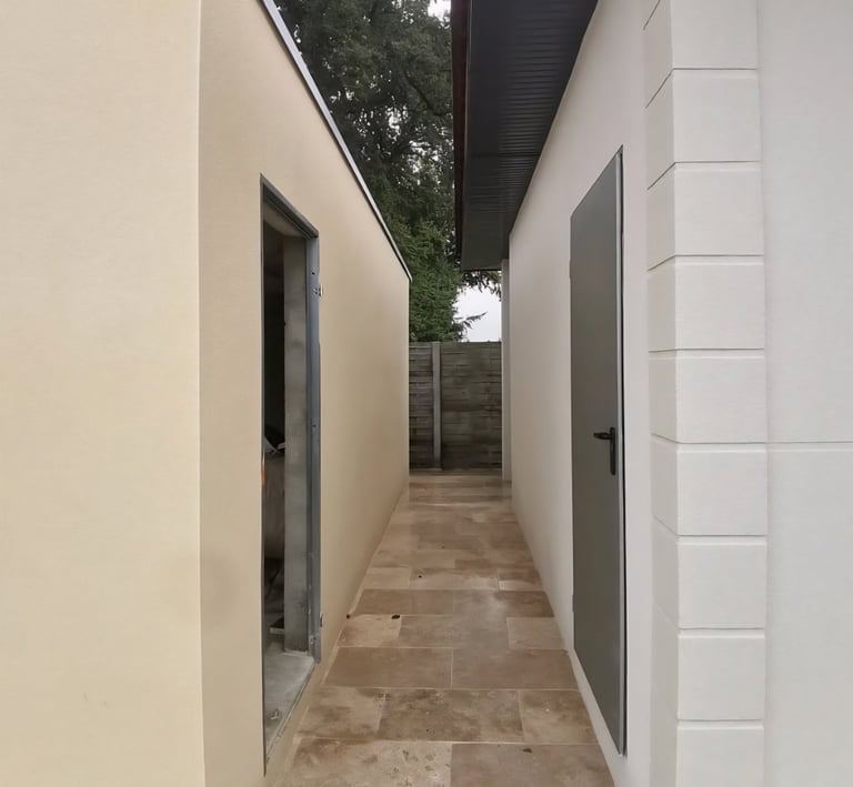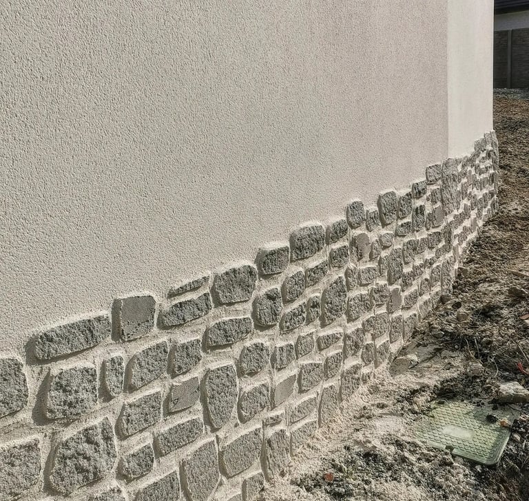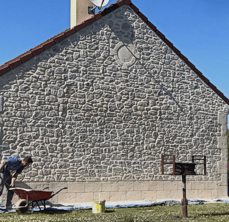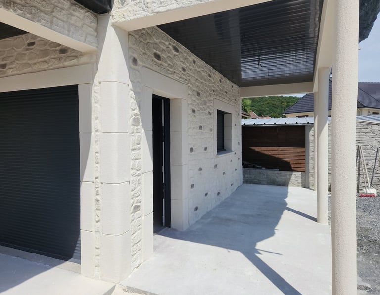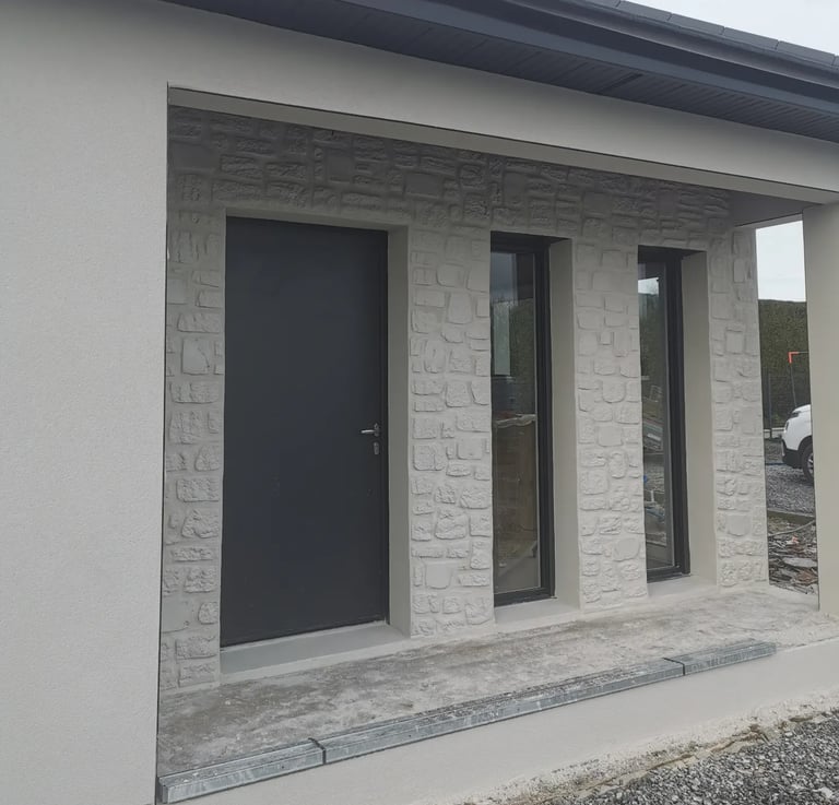 Descente de Jardin à Yvetot, une finition pierre gris foncé avec un enduit gratté blanc cassé.