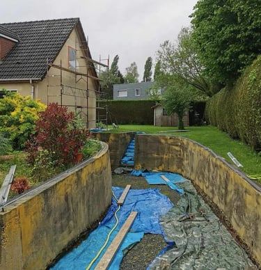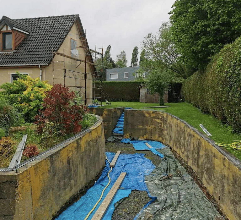 Maison complète en rénovation du côté de Bourg-Achard. Un enduit de fond blanc en finition gratté. Un mur de soutènement finition éponge.