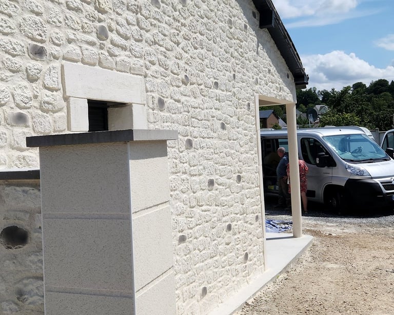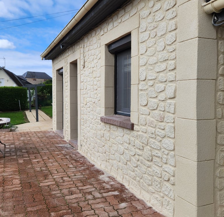 Maison complète dans le 27, soubassement effet pierres de taille, chaînages d'angles rustiques, fond en pierres grisées. Du charme.
