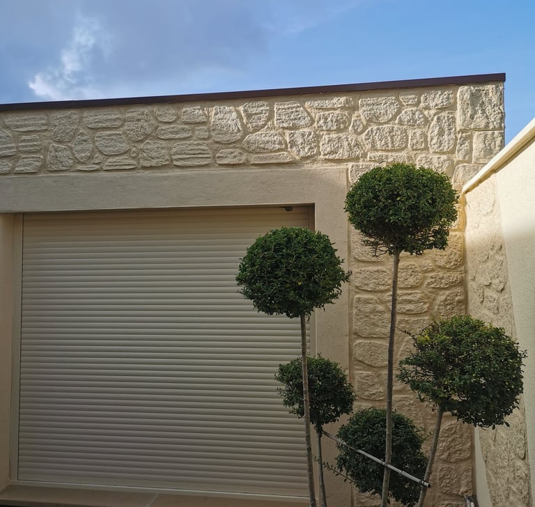 Ravalement complet d'une maison et de son garage. Des encadrements en sur-épaisseur 30 par 30, des clés de linteaux et des bandes ceinturantes.