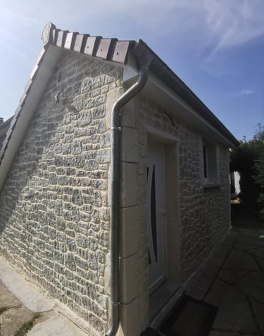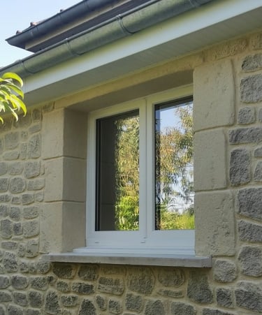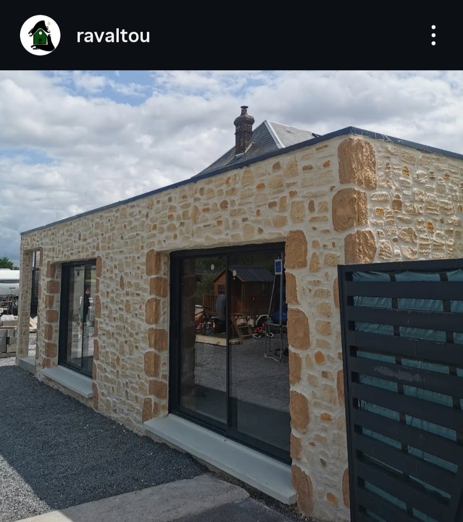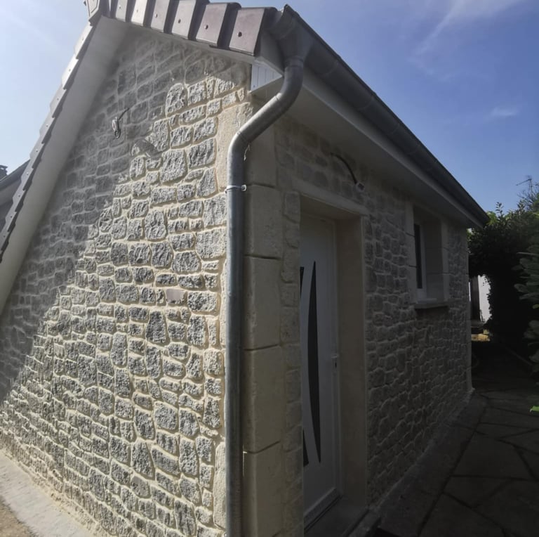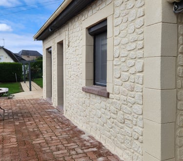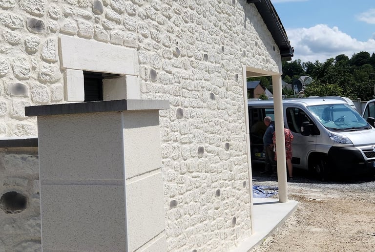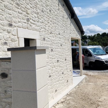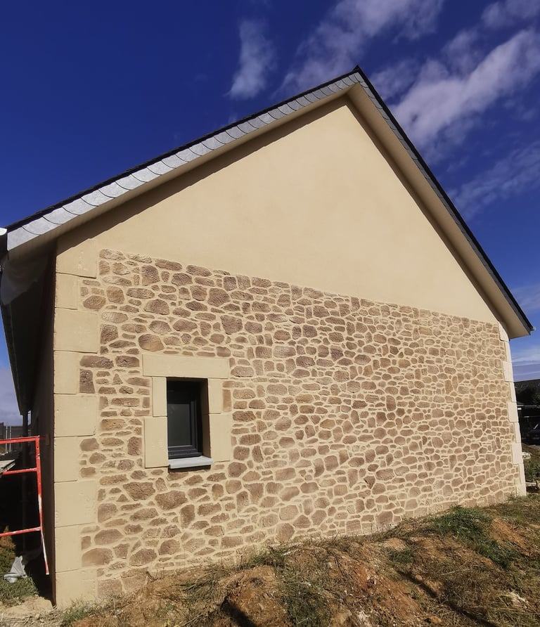 Sur ce chantier situé dans l'Eure (27000), nos clients désiraient un rendu chaleureux. Nous avons donc opté pour une petite pierre en ton sable, avec un chainage décalé en sur-épaisseur (petite pierre/grande pierre).