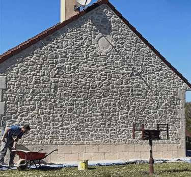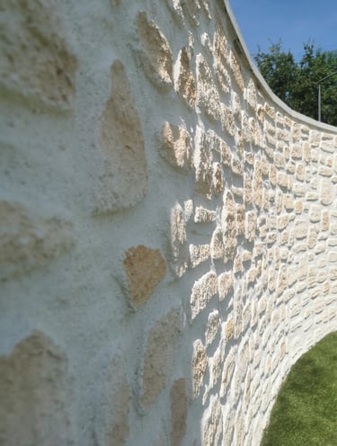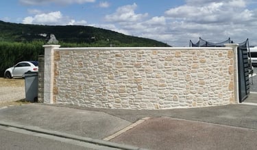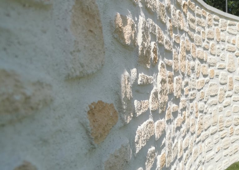 Sur ce mur de jardin en rénovation, nous sommes partis sur un aspect pierre en cascade sur la partie inférieure ainsi qu'un enduit gratté sur la partie supérieure. Toutes les couleurs, formes, profondeurs et styles peuvent varier. N'hésitez pas à nous contacter pour la réalisation de votre mur en aspect pierre.