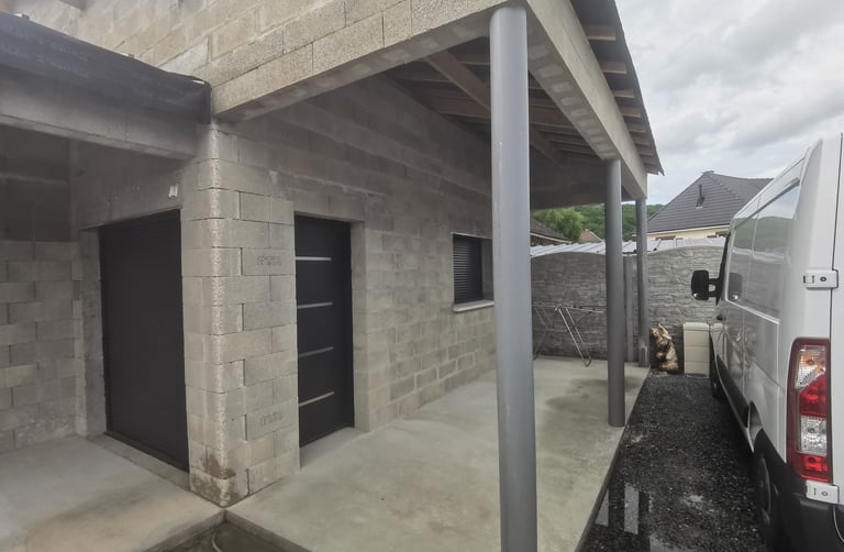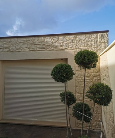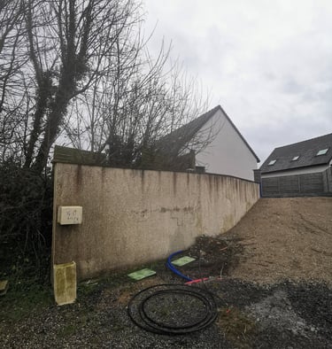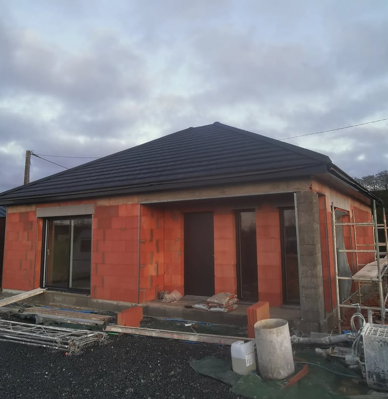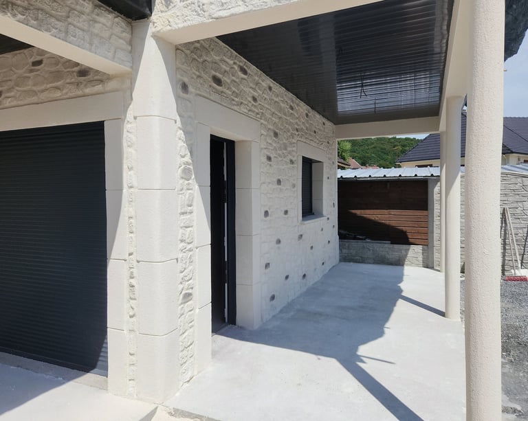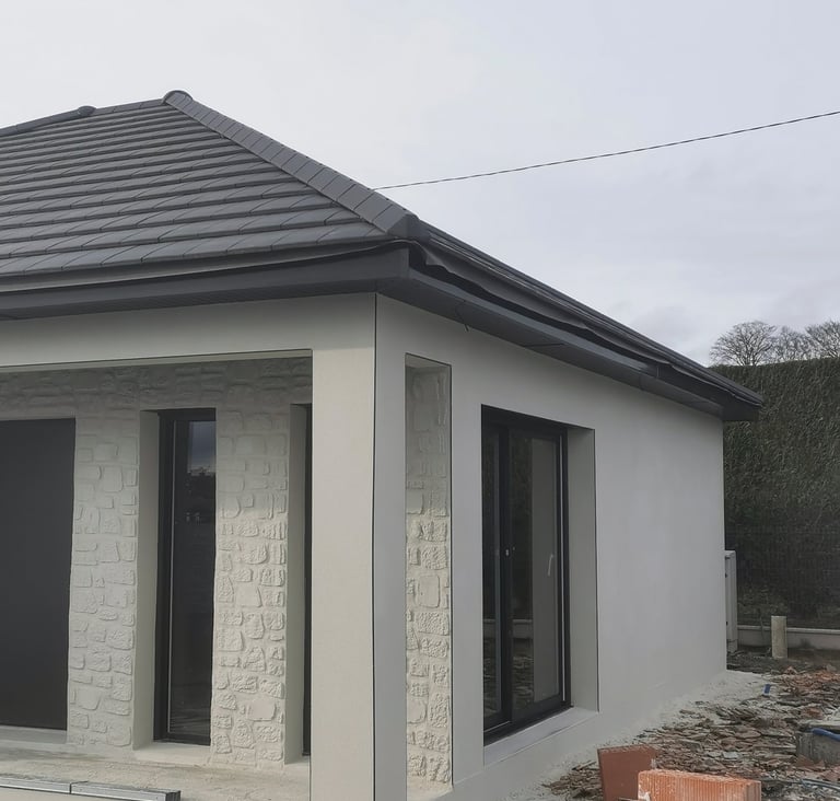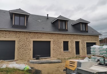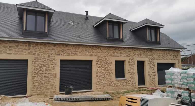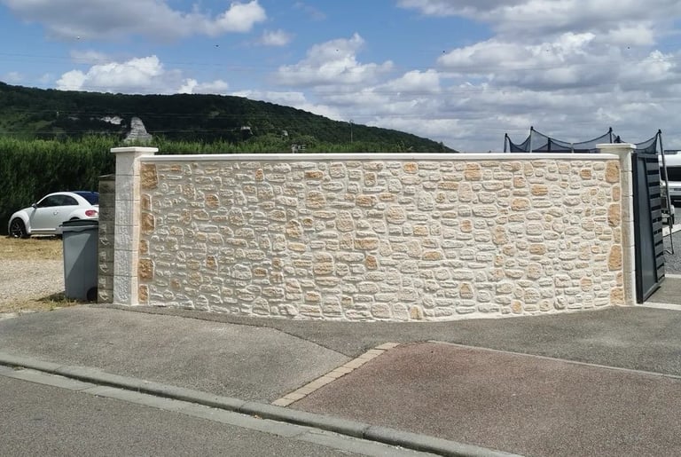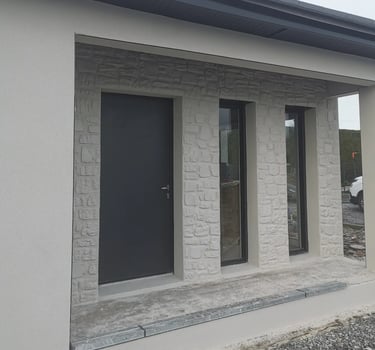 Sur ce chantier situé dans l'Eure (27000), nos clients désiraient un rendu original aux couleurs harmonieuses. Nous avons opté pour des chaînages de pierre type Lanzarote avec un dégradé brun jaune. Maison neuve ainsi que mur de jardin.
