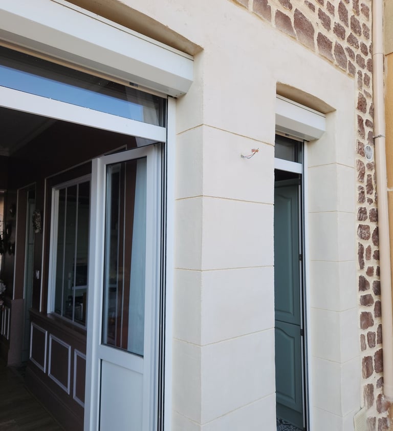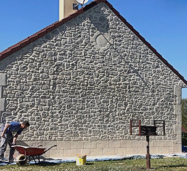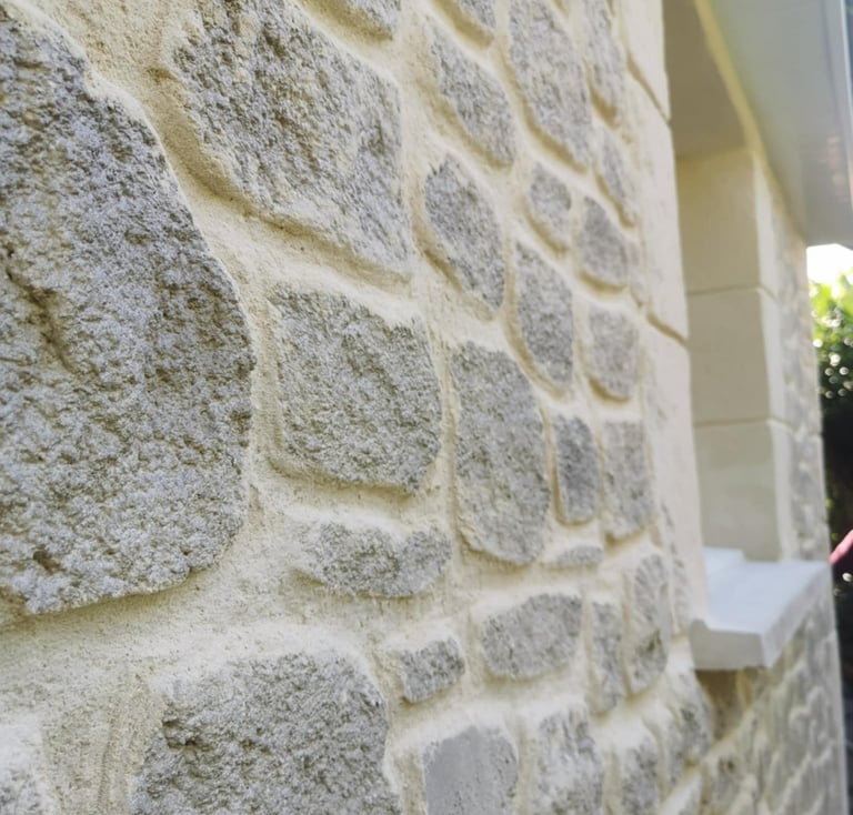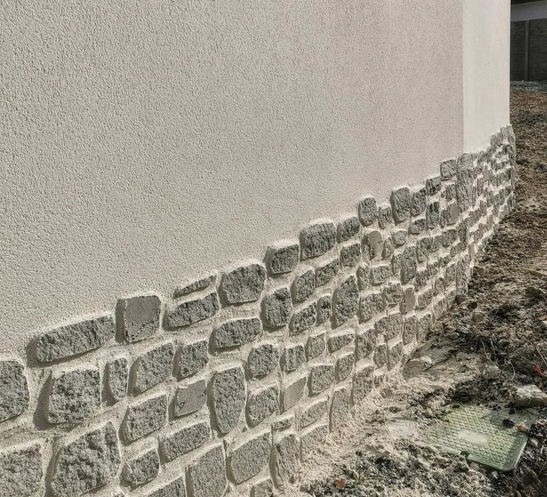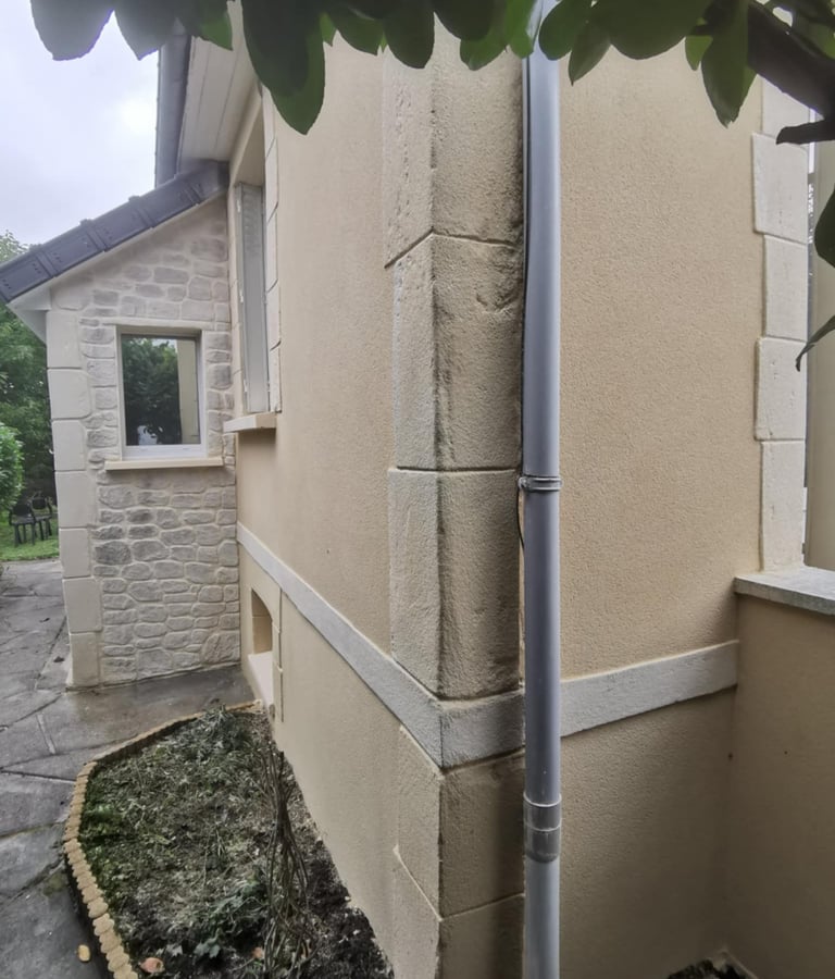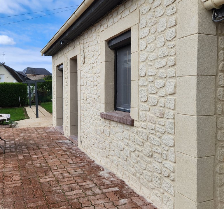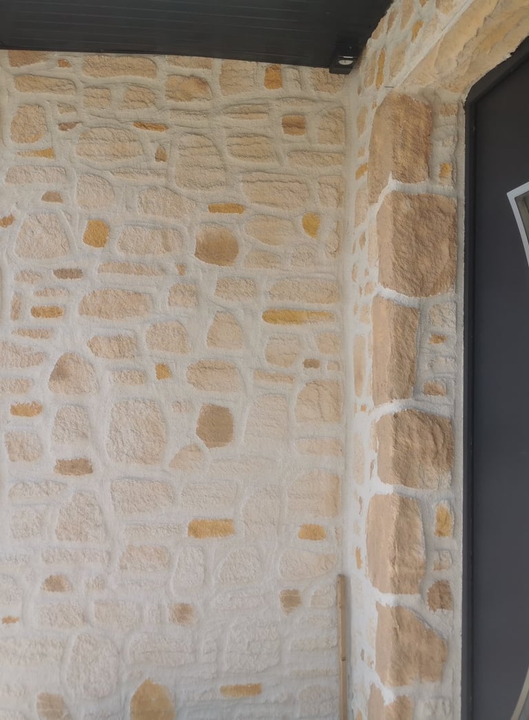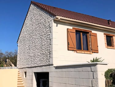 Nos clients souhaitaient donner à leur maison qui était lisse et couleur sable, le charme du rustique et de la pierre. Nous avons opté pour un soubassement style pierre de taille, un enduit avec un voile grisé, et son accompagnement, des chaînages d'angles façon rustique.