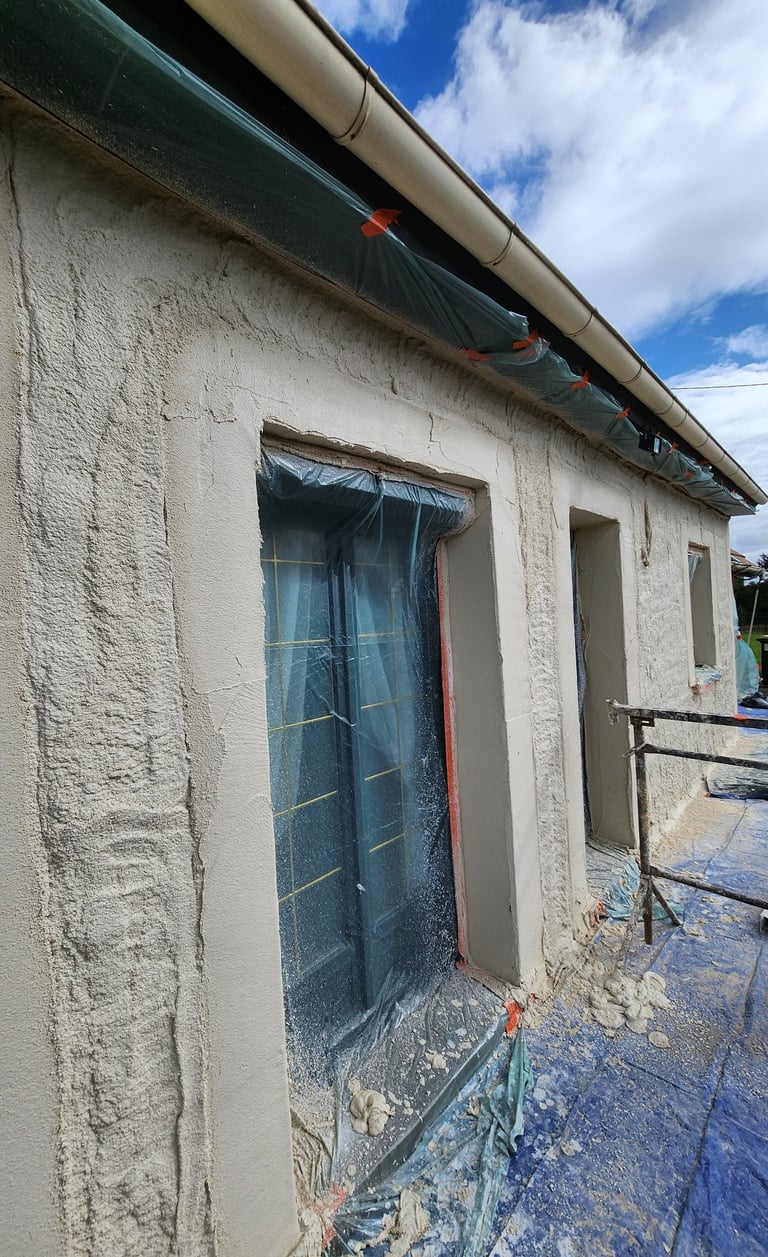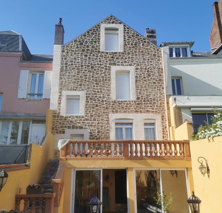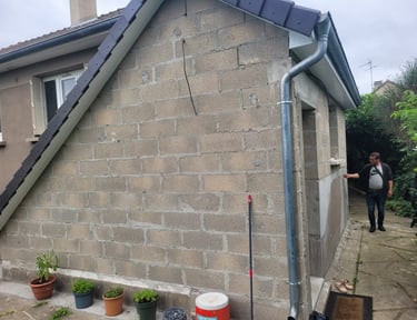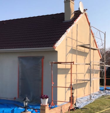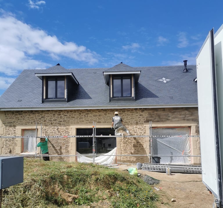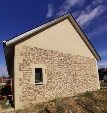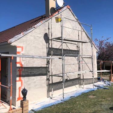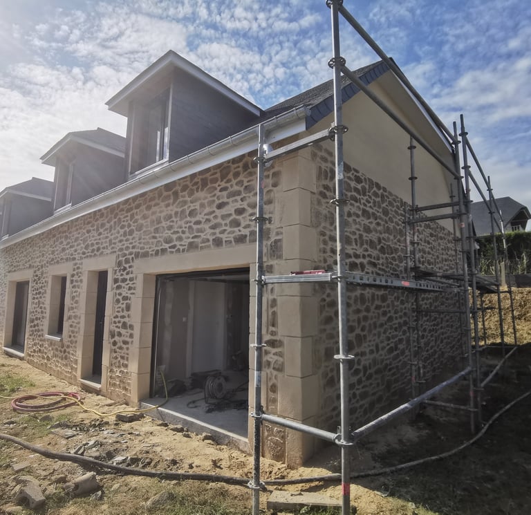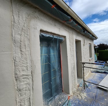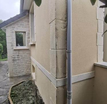 Nous pouvons apercevoir deux chantiers en un, d'une part, le ravalement effet pierre sur une maçonnerie d'extension très mal réalisée que nous avons rattrapé (Grillagé, renforcement, et sous-enduit) et d'autre part la maison entière :