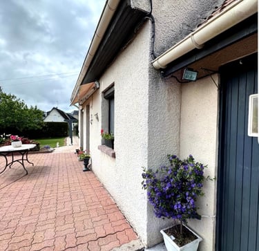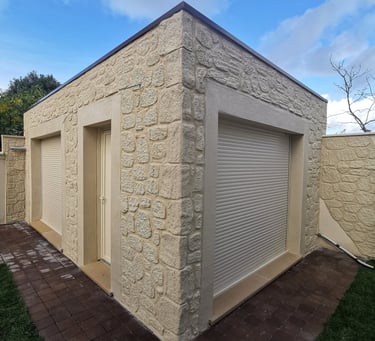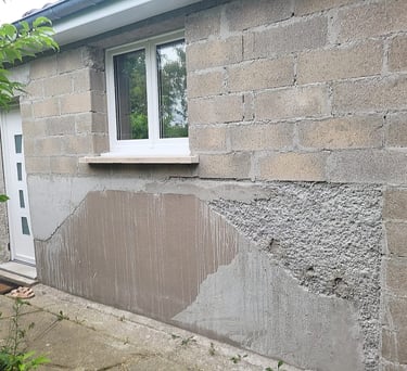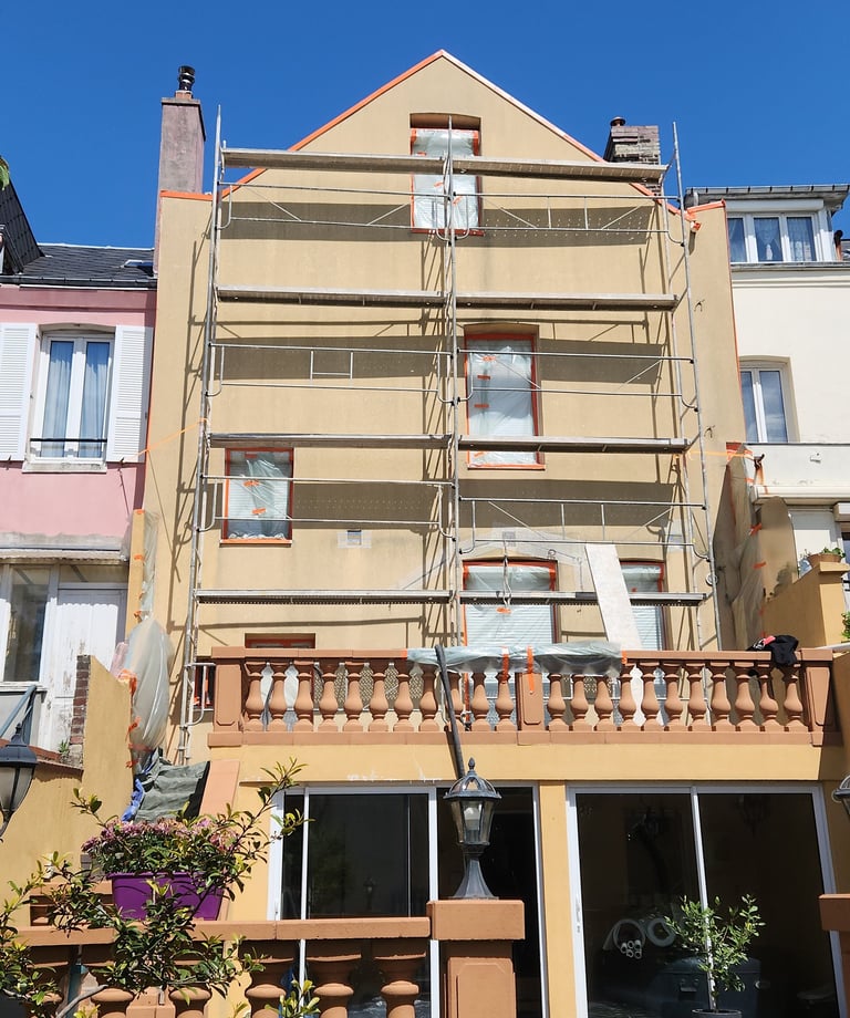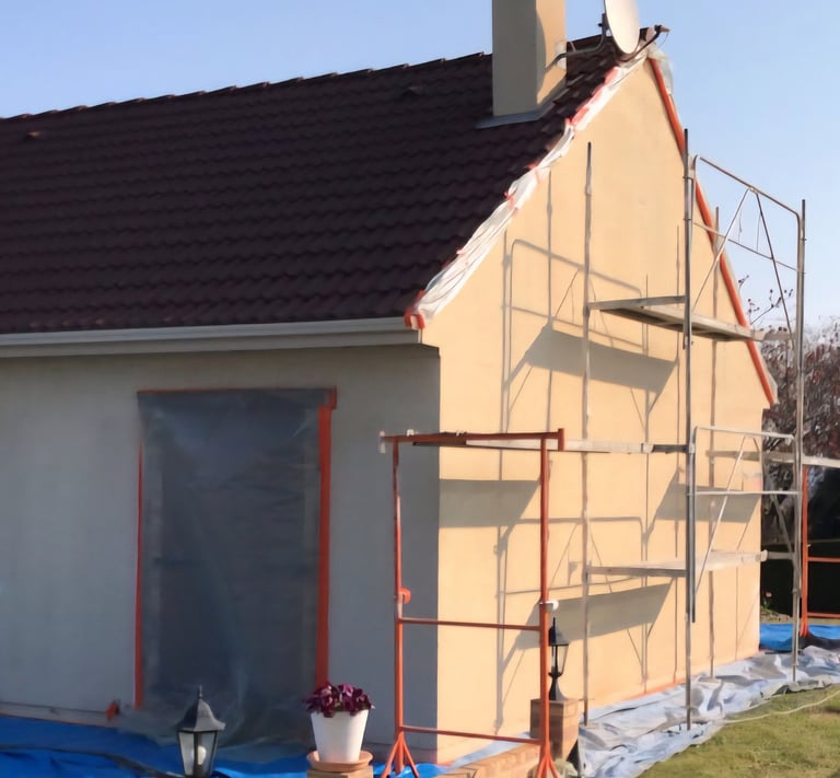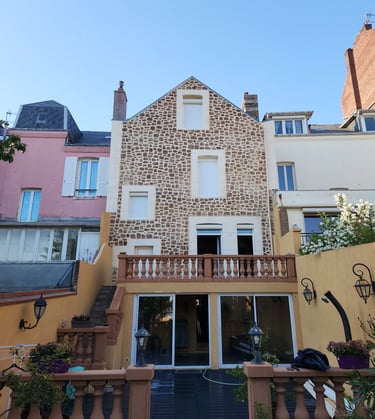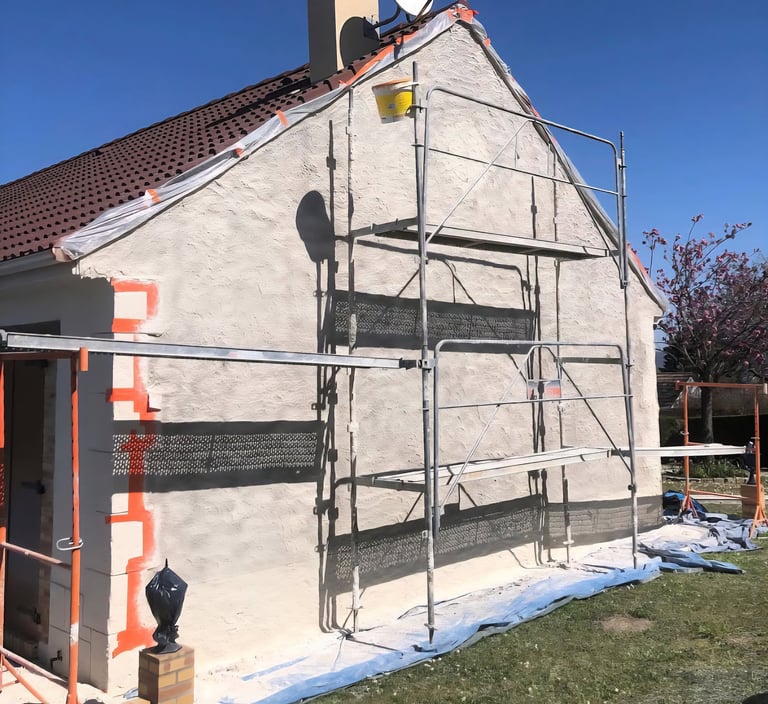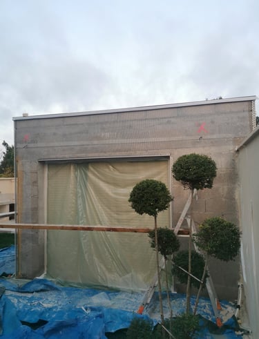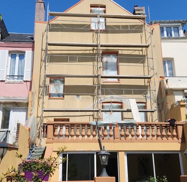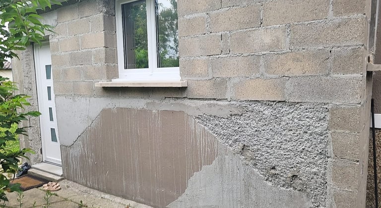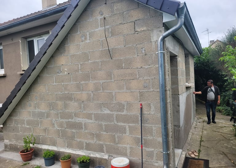 Nous pouvons apercevoir deux chantiers en un, d'une part, le ravalement effet pierre sur une maçonnerie d'extension très mal réalisée que nous avons rattrapé (Grillagé, renforcement, et sous-enduit) et d'autre part la maison entière :