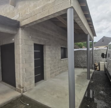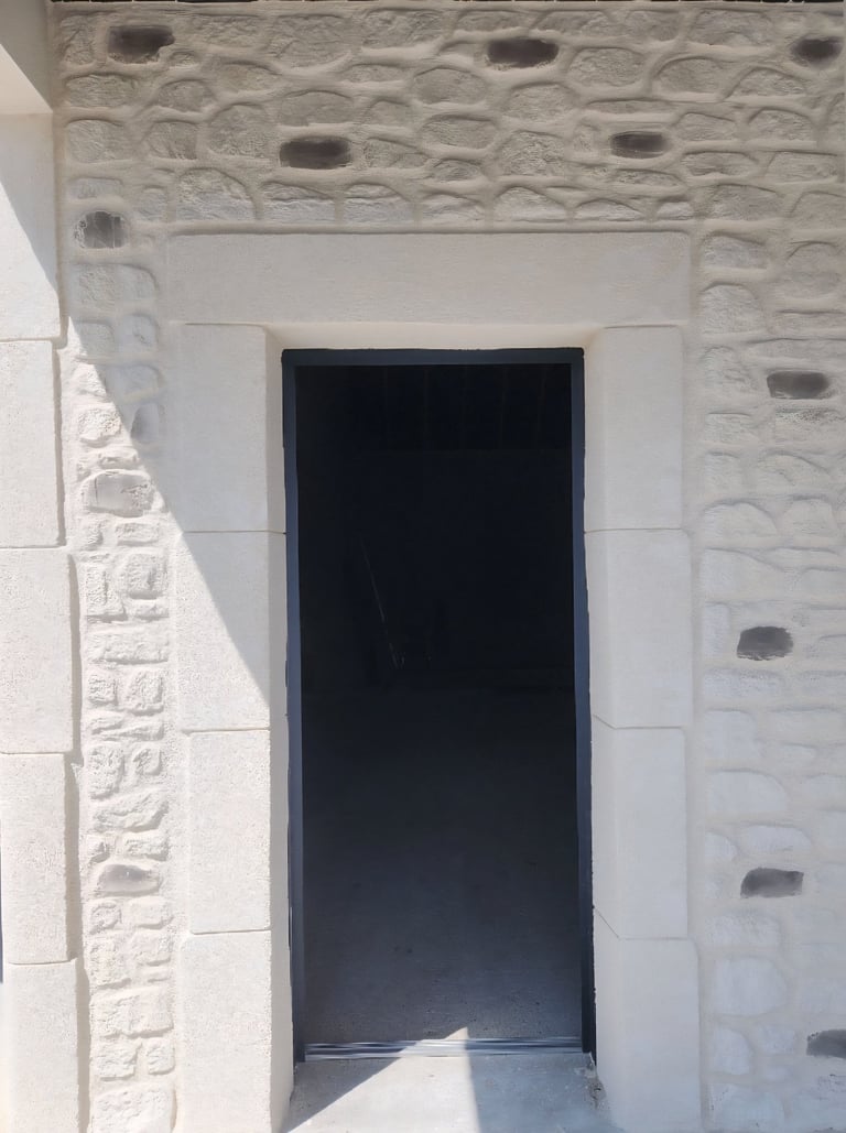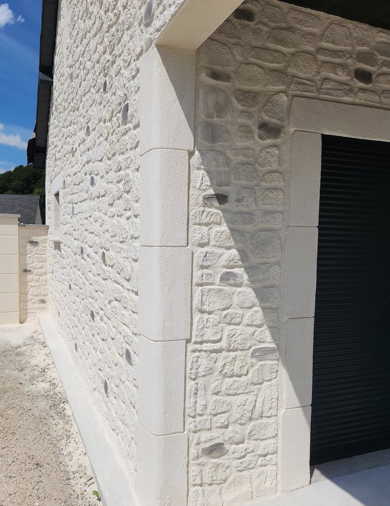Pour les éléments en sur-épaisseur, nous avons opté pour des chainages types pierres longues et courtes. Nous sommes sur une construction neuve avec des piliers en finition gratté.