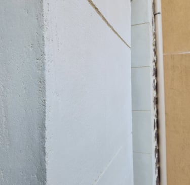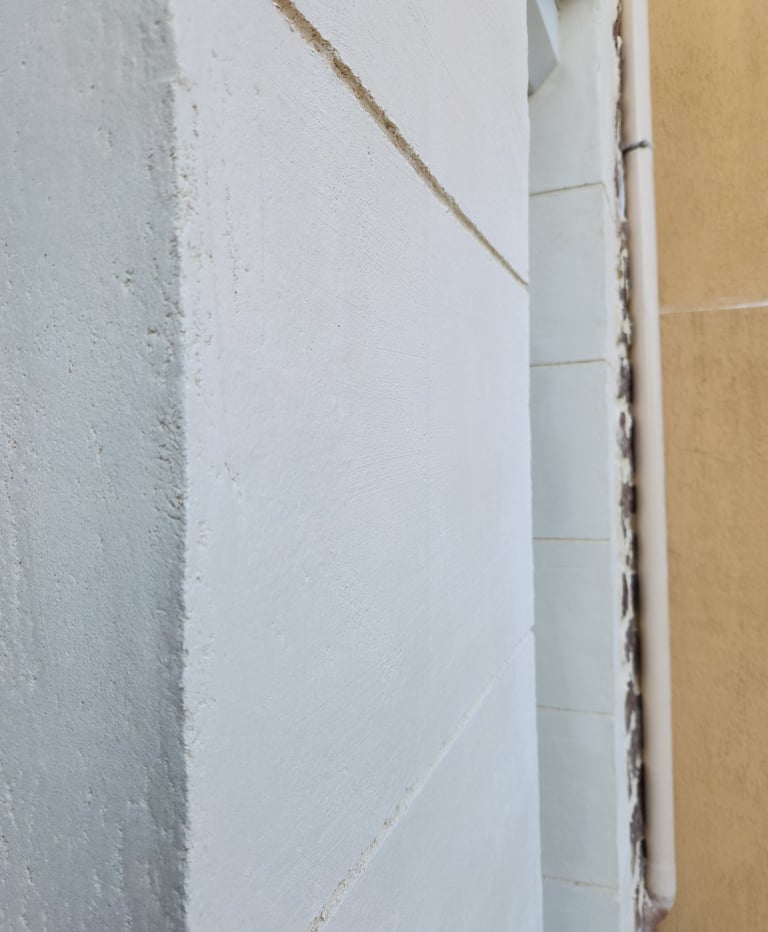 Les clients de cette maison située au Havre souhaitaient des contours de fenêtres en sur-épaisseur. Leur idée, était d'avoir un rendu très lisse et imposant. Le chaînage ici présent est en cours de séchage avant de donner une couleur plus claire (photo zoom en haut à droite). Le choix a été également porté sur une pierre aux reflets brun foncé. Après avoir déposé tous les éléments de façade, nous avons grillagé les fissures et les parties fragiles. Ici, le support sur lequel nous travaillons est un ancien ITE par dessus lequel les précédents façadiers ont appliqué un enduit d'une épaisseur fine.