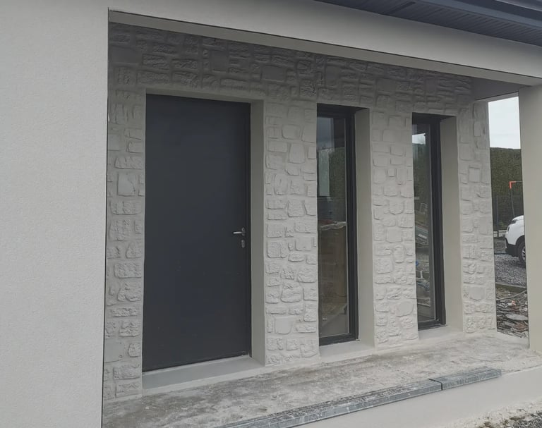 Sur ce chantier situé dans le Calvados, nos clients désiraient un rendu sobre et épuré. Des pierres majoritairement blanches avec quelques unes grisées.