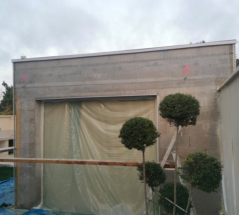 Le support type "parpaing rouge" absorbe énormément l'eau. Suite à cette rétractation l'enduit peut fissurer dans les semaines suivant le séchage. Là où parfois, un Gobetis suffit à empêcher cette rétractation. De notre côté, nous avons appliqué un ciment bâtard avec un treillis en fibre afin d'avoir la solidité maximale sur cette maison neuve. 7 ans après, aucune fissure.